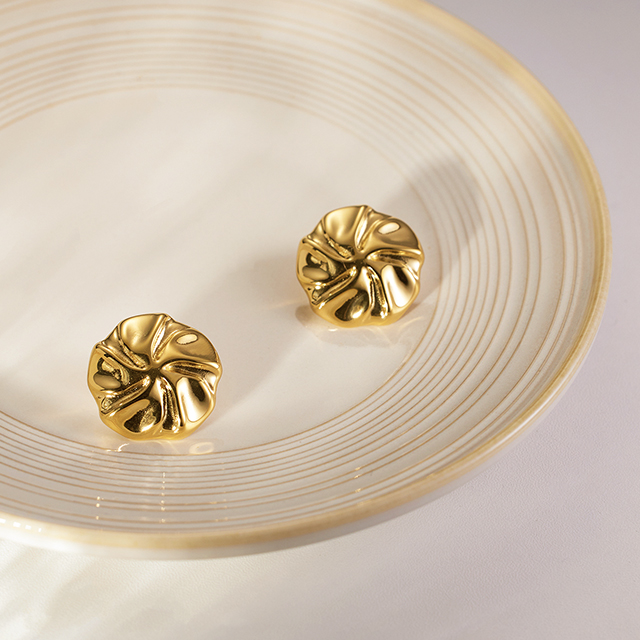 Classic Round Flower Pattern Stainless Steel Stud Earring Jewelry In Gold Color Plated